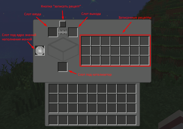 Для рецептов, требующих колдовской/алхимический катализатор - необходимо установить соответствующий апгрейд в сборщик. Колдовской катализатор не удваивает ресурсы через МЭ систему и используется только для трансформации одних ресурсов в другие.