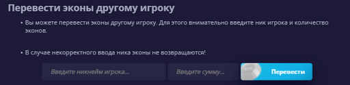 Монеты и эконы можно переводить другим игрокам. Также игрокам доступен перевод эконов на сервер и с сервера в личный кабинет на сайте.