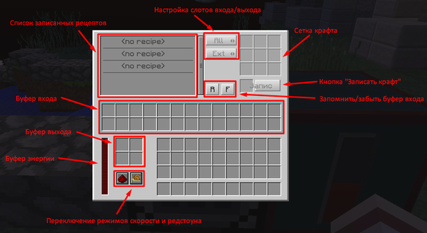 Для начала работы создателя необходимо записать в него рецепт крафта, нажав в панели со списком записанных рецептов на и выложив крафт на сетке крафта, затем нажать на кнопку "Запись". Рецепт запишется.