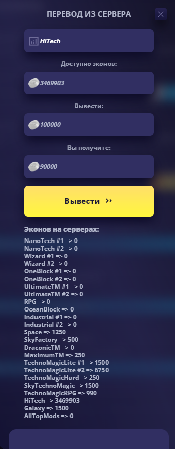 Для вывода эконов с сервера необходимо указать сервер, с которого надо вывести эконы и сумму вывода. Поле "Доступно эконов" заполняется автоматически, после выбора необходимого сервера. Стоит учесть, что при выводе эконов с игрового сервера присутствует комиссия 10%.