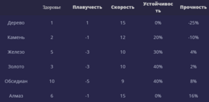 Детали голема могут состоять из следующих материалов (ещё от типа материала будет зависеть, как быстро голем будет выполнять ту или иную задачу):