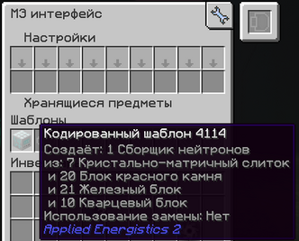 Затем необходимо записать любой крафт в МЭ Терминал больших шаблонов и положить шаблон в интерфейс, подключенный к большому молекулярному сборщику.