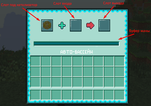 Этот механизм позволяет мгновенно создавать все рецепты из обычного бассейна маны. Ингредиенты могут подаваться через трубы, шины, интерфейсы. Поддерживает алхимический и колдовской катализаторы.