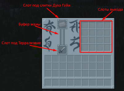 Для работы механизма необходимо установить Терралезвие в соответствующий слот. Для самого же призыва Гайи необходимо положить слиток Духа Гайи в верхний слот и подать ману на механизм при помощи искры. На один призыв требуется 1 228 800 маны.