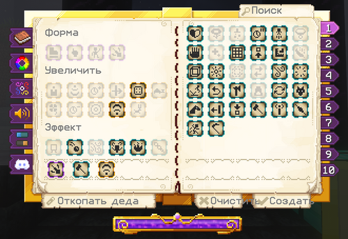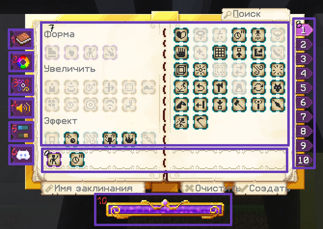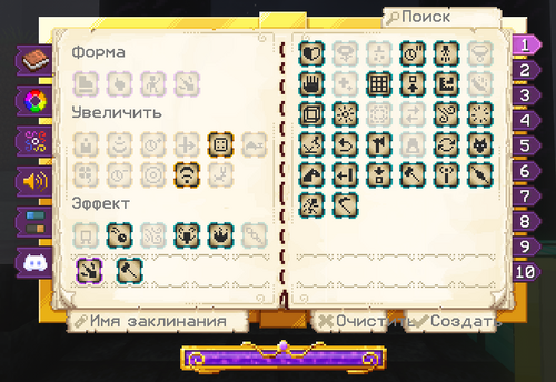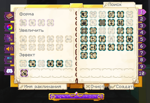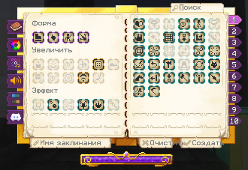 Комбинируя различные эффекты и усиления можно создавать свои собственные заклинания с желаемыми взаимодействиями.