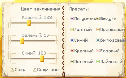 В настройке звука есть несколько вариантов звучания заклинания, объём влияет на громкость заклинания, шаг влияет на то, как быстро отзвучит заклинание.
