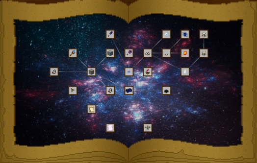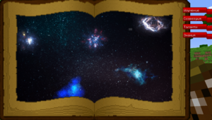 В этом журнале всё то, чем нам предстоит заниматься. Открыть журнал для просмотра - ПКМ, открыть слоты для хранения свитков - Shift+ПКМ. Если вы откроете журнал сразу при заходе, то увидите одну галактику - "Открытие" и одну красную закладку с правого края книги - "Изучение". В процессе знакомства с модом, вы откроете еще четыре галактики и три закладки.