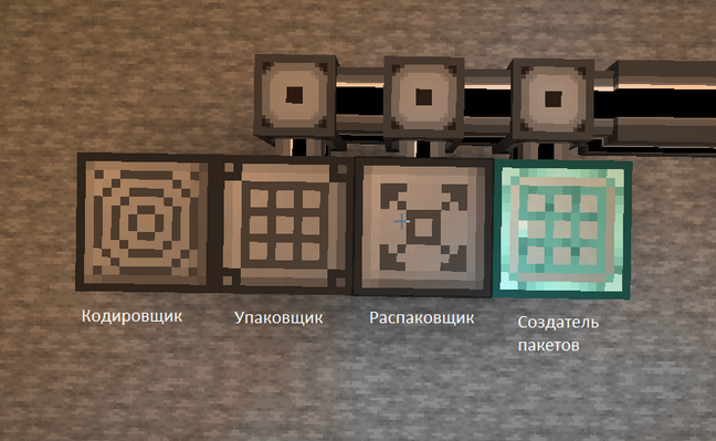 Кодировщик можно не подключать к сети. Все остальные механизмы можно напрямую подключать к вашей МЭ системе, во внешнем источнике энергии они не нужндаются. Упаковщик и распаковщик должны находиться в ондой системе и распаковщик должен стоять рядом с создателем пакетов.