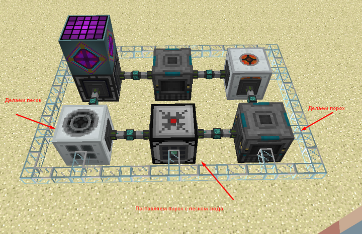 1) По такой же логике как и с порохом берем любой источник булыжника и отправляем его в дробитель (Industrial) на выходе получаем песок