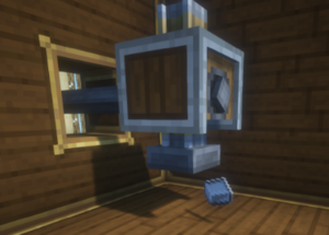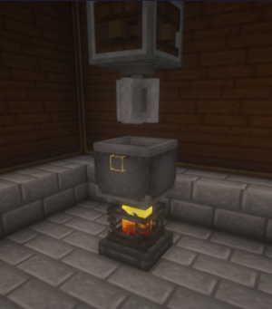 Механический смешиватель соединяет жидкости и сплавы, при помощи него можно сделать "Латунь". Для работы надо разместить горелку и чашу как показано на фото. для того чтобы в горелке оказался всполох нужно кликнуть по нему горелкой ПКМ, для того чтобы повысить температуру нужно дать всполоху горючее (доски, древесина и т.д).