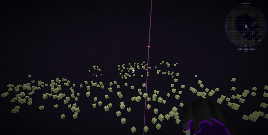Как только вы будете приближаться к данным координатам, то вы увидите данную картину: летающие блоки эндерняка, расположенные по нескольким кругам с большим радиусом (скриншот ниже, обратите внимание на карту)