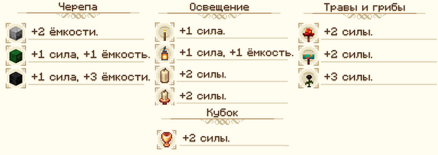 Предметы, которые дают силу и ёмкость алтарю остаются прежними.