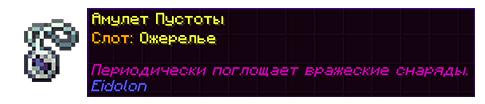 Амулет пустоты - при ношении, снаряды которые бы поразили владельца - поглащаются, после этого амулет уходит на 10 секундную перезарядку.