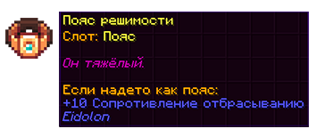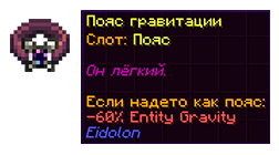 Пояс гравитации - гравитация на владельца значительно уменьшается, значительно замедляя падение и уменьшая урон от него.