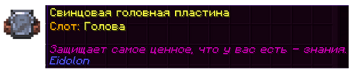 Свинцовая головная пластина - снижает потерю опыта при смерти, сохраняя 3/4 опыта владельца. Дает иммунитет к тошноте, так же дает защиту от нежелательных вторжений в вашу голову, например: Древний Страж не будет накидывать на вас эффект утомления.