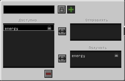 1. Тип передачи. В левой части интерфейса нужно выбрать, что именно вы будете пересылать: энергию (красный значок), предметы (зеленый) или жидкости (синий). На одной частоте можно передавать только что-то одно, поэтому для предметов и жидкостей придется создавать разные пары передатчиков или использовать плату расширения.