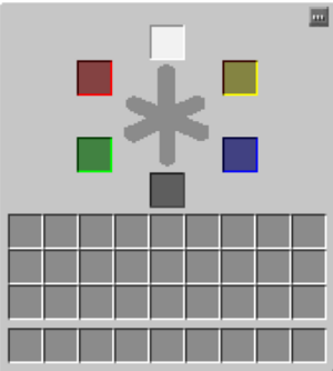 Интерфейс узла насчитывает 7 слотов: 1 сверху и 6 снизу, верхний слот предназначен для поступающих в узел предметов, нижние - для улучшений (о них позже).