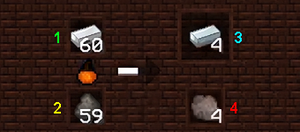Интерфейс доменной печи. Помещаем в печь 1) железный слиток и 2) коксовый уголь, а получаем 3) закалённое железо и 4) шлак