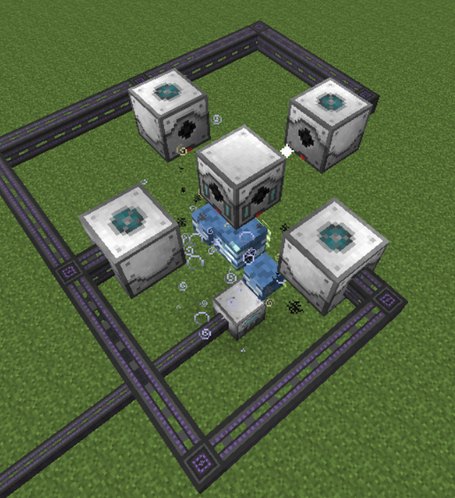 Далее строим такую конструкцию над камерой стазиса на высоте в 4 блока. В центре основа жидкостного лазера. Лазерные дрели могут быть расположены хоть как, главное, чтобы они смотрели на основу и основа была в их радиусе действия. Все дрели, а также камера стазиса должны быть запитаны.