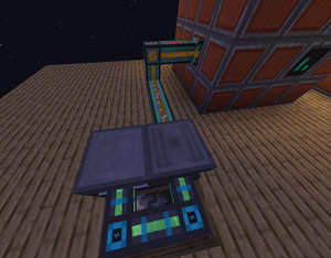Теперь нам надо автоматизировать подачу воды в первый испаритель. Я использую 4 насоса из Ic3, можно использовать и помпы из Mekanism. Насосы подключаем к универсальным(электрическим) и механическим(жидкостным) и ставим жидкостную трубу на вытягивание, что бы вода попадала в трубы и со стороны, куда будет подходить вода в вентиль теплового испарителя подводим трубу.