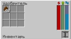 Кладем его внутрь удобрителя. Сам интерфейс у него элементарный. Слоты под удобрение. 3 шкалы: энергия (красная), прогресс (зеленая), ожидание (Zz синяя). Под этими шкалами у всех механизмов этого мода находится слот под улучшения