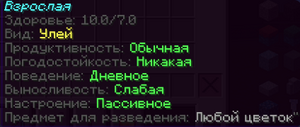 Если поместить пчелу в клетку и зажать клавишу Shift, вы сможете увидеть её генетические особенности, включая продуктивность, погодостойкость, поведение, выносливость и настроение.