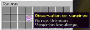 Также нужна книга вампира. Она выпадает либо с продвинутых охотников, либо с продвинутых вампиров (это не Бароны, продвинутые вампиры, как и продвинутые охотники, носят имена). Книги могут быть с разными названиями, самое главное, чтобы имели одну и ту же текстуру: